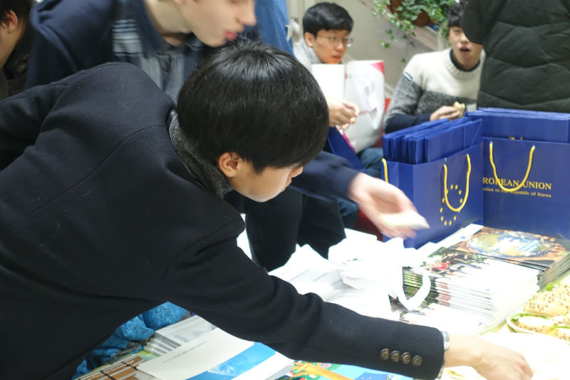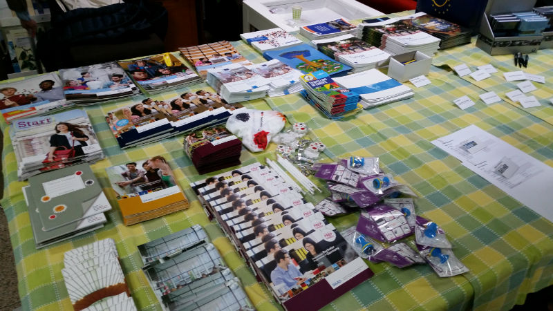 Zusätzlich zu ihrem Fachwissen rund um Ausbildung, Studium und Karriere brachten die Beraterinnen und Berater vielseitige Informations- und Werbematerialien mit, so dass bei den Gesprächen und auf den Tischen im Foyer umfangreiche Broschüren, Stifte und andere Geschenke auslagen.