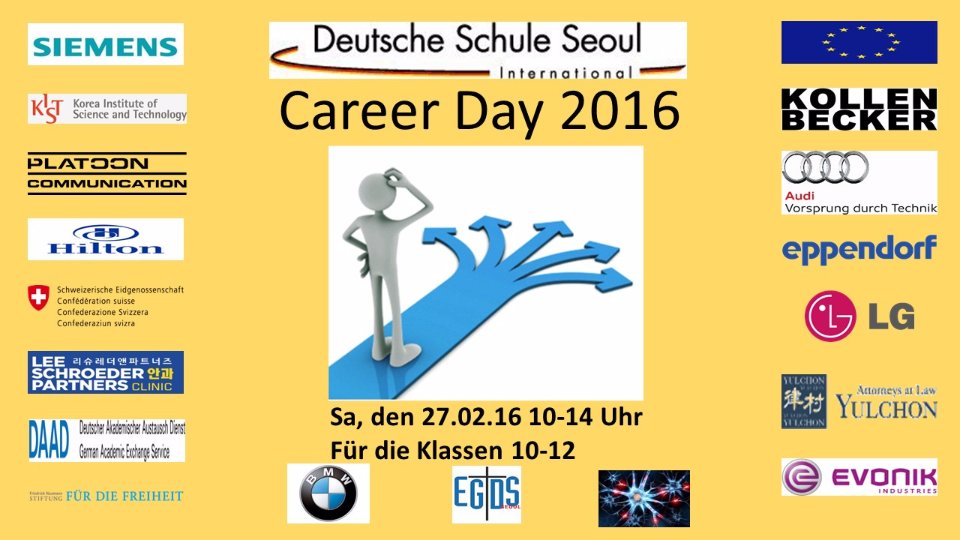 Wenn auch Sie Interesse daran haben, unserer Oberstufe bei der Studien- und Berufsorientierung (wieder) beim nächsten Career Day 2017 zu informieren, so kontaktieren Sie mich gerne unter nfeigl@dsseoul.org!