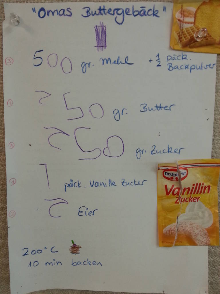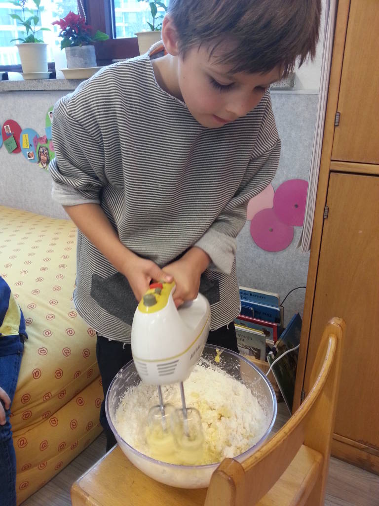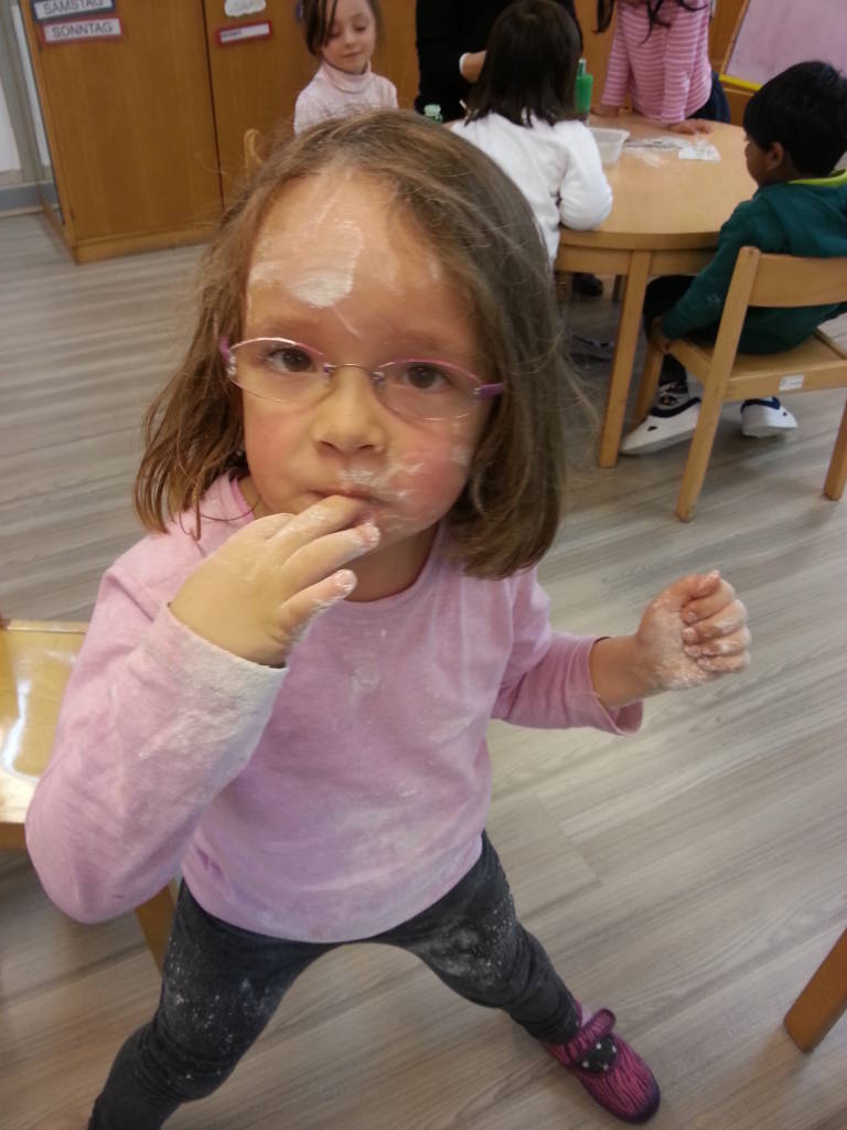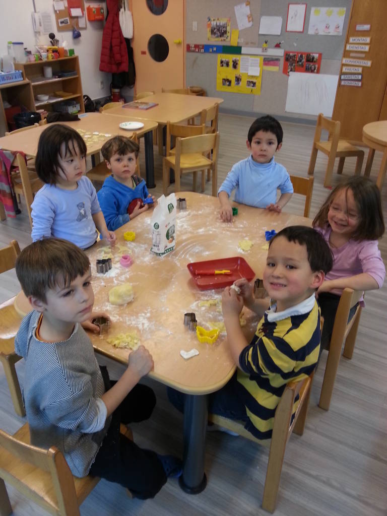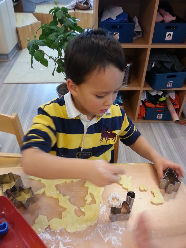 Den ganzen Dezember lang treffen wir uns regelmäßig in der Feuersterngruppe des Kindergartens zum gruppenübergreifenden Backen. Nach „Omas Rezept“ werden feine Butterplätzchen mit Glocken, Engeln und Tannenbäumen etc. ausgestochen. Jeden Mittwoch treffen sich Kinder aus allen drei Gruppen um gemeinsam zu kneten, auszustechen und auch am Ende ein bisschen zu naschen. ;)
