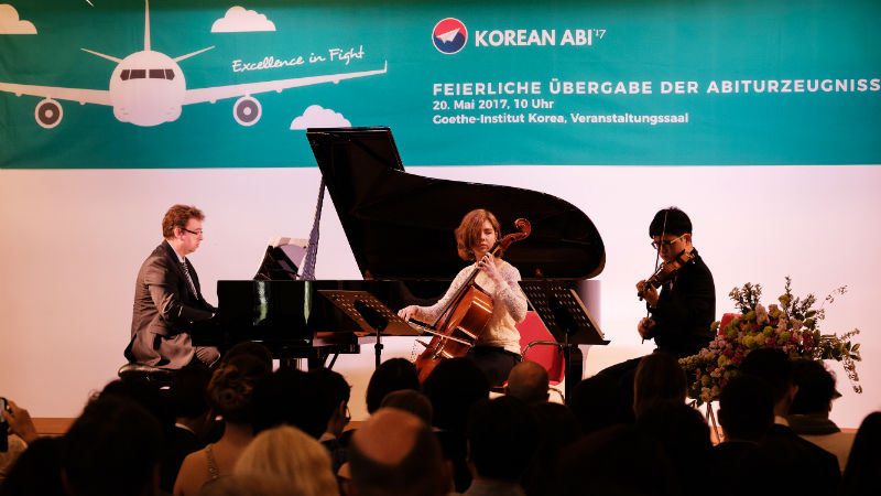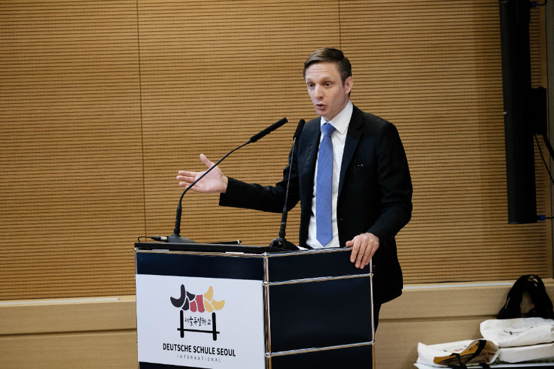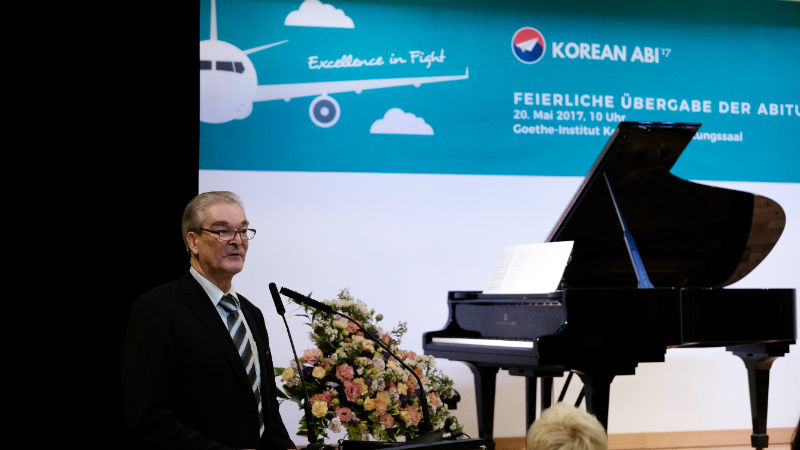 Nach einer musikalischen Einstimmung durch Ann Kathrin Bergmann und Ki-Hyun Choi (Klasse 11) gemeinsam mit Herrn Mäder, begrüßte der kommissarische Schulleiter Herr Andreas Hilsbos die zahlreichen Gäste im Goetheinstitut, dass der DSSI auch in diesem Jahr freundlicherweise seine Räumlichkeiten zur Verfügung stellte.